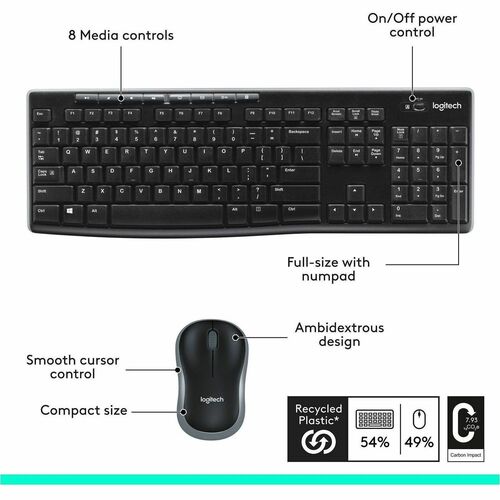 This convenient all-in-one set includes a full-size keyboard featuring quiet, low-profile keys and a comfortable, contoured wireless mouse. With a strong, reliable long-range wireless connection and impressive battery life, this streamlined combo delivers the dependable performance of a wired setup—without the tangled cords.